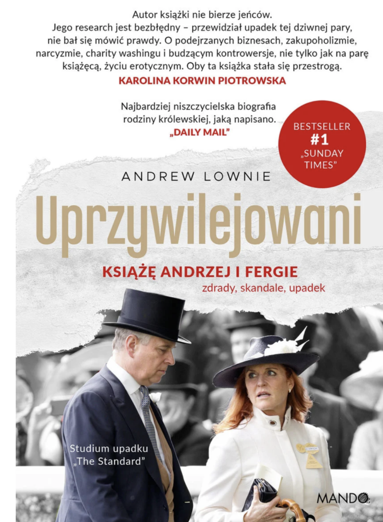 - „Uprzywilejowani. Książę Andrzej i Fergie – zdrady, skandale, upadek” Andrew Lownie (wyd. Mando) tłumaczenie: Jacek Konieczny, data premiery: 22.04.2026 – opis pochodzi od wydawcy: „Jeszcze niedawno należał do grona najbardziej uprzywilejowanych członków brytyjskiej rodziny królewskiej. Dziś – pozbawiony przez własnego brata króla Karola III tytułu i przywilejów – jest symbolem upadku monarchii i jej największego grzechu: poczucia bezkarności. Jak doszło do tego, że ulubiony syn królowej Elżbiety II stracił wszystko i stał się jedną z najbardziej pogardzanych osób w Wielkiej Brytanii? Andrzej i Fergie od początku budzili kontrowersje. Ich ślub znalazł się w centrum zainteresowania całego świata – podobnie jak rozwód. Mimo burzliwego rozstania, ostatecznie zamieszkali pod jednym dachem i ogłosili się „najszczęśliwszym rozwiedzionym małżeństwem na świecie”. Ale czego tak naprawdę o nich nie wiemy? Ta książka to pełna sensacyjnych odkryć wspólna biografia księcia i księżnej Yorku – od bajkowego ślubu przez podejrzane interesy i finansowe nadużycia po skandaliczne powiązania z Jeffreyem Epsteinem. Aby pozwolić sobie na szokująco rozrzutny i pełen ekscesów styl życia, Andrzej i Fergie nie cofnęli się przed niczym. Zachłanność, seks i przywileje składają się na bezlitosny portret rozpieszczonego arystokraty i jego gotowej na wszystko partnerki.”